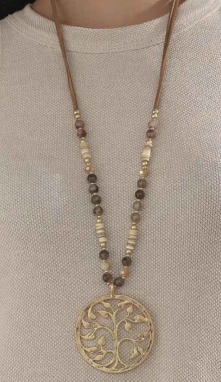 Gold tree of life with brown and beige beads